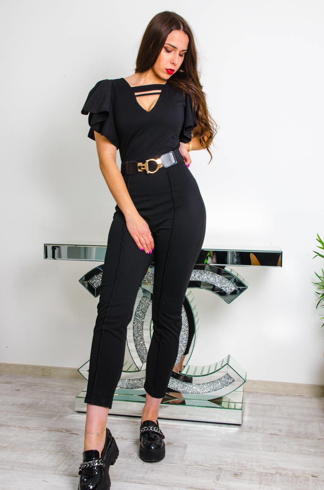 CZARNY KOMBINEZON Z FALBANĄ W RAMIONACH-WYCIĘCIE W DEKOLCIE I PLECACH " V"