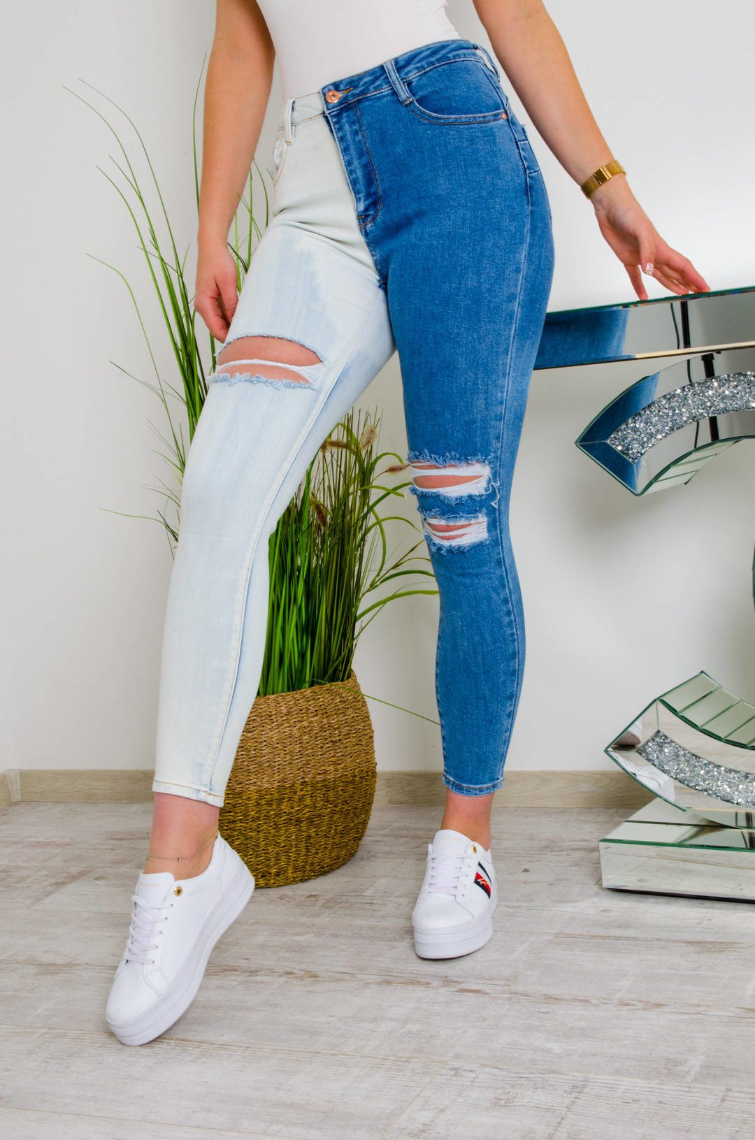 DWUKOLOROWE SPODNIE JEANSOWE TYPU PUSH UP Z DZIURAMI