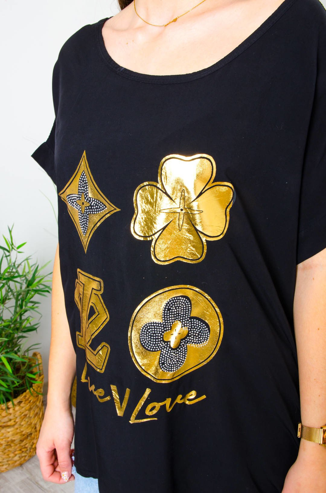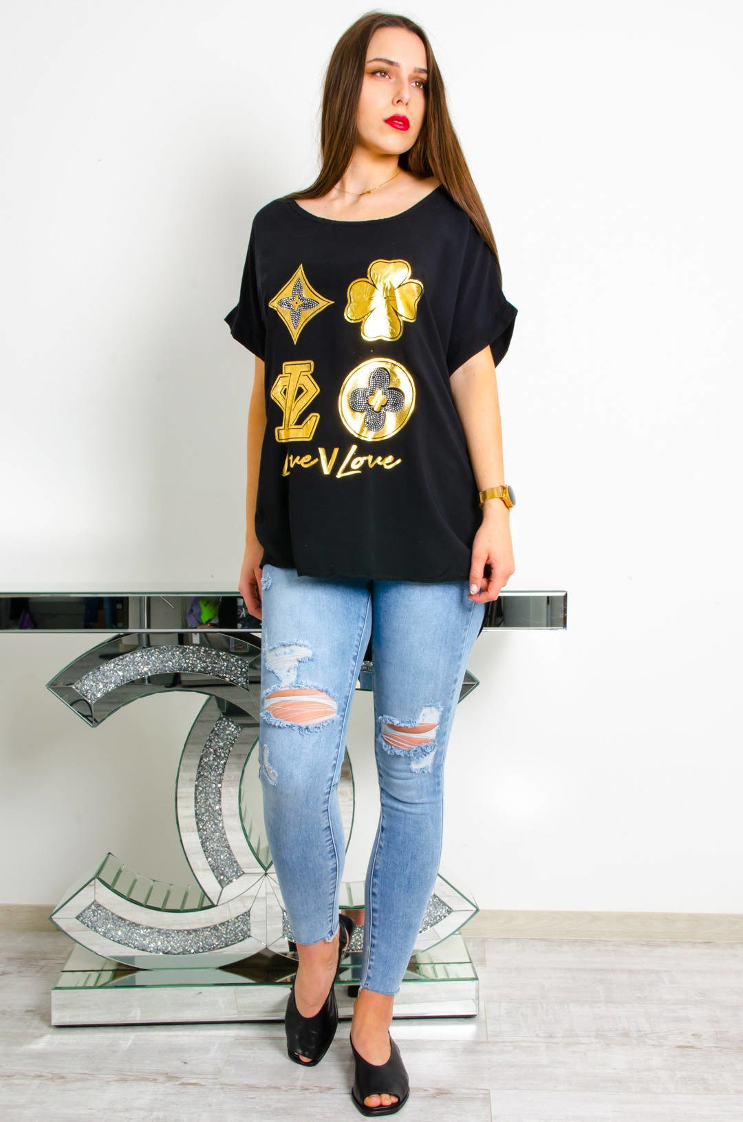 CZARNA BLUZKA ZE ZŁOTĄ APLIKACJĄ I NAPISAMI
