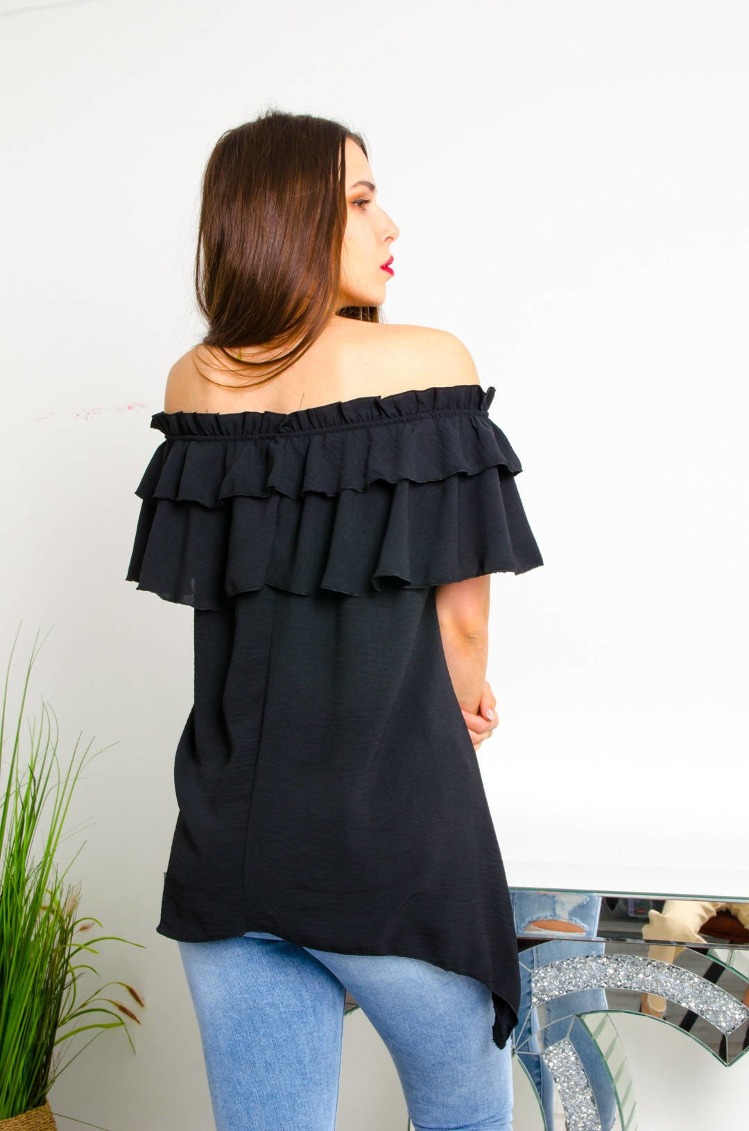CZARNA BLUZKA Z FALBANĄ ORAZ DŁUŻSZYMI BOKAMI