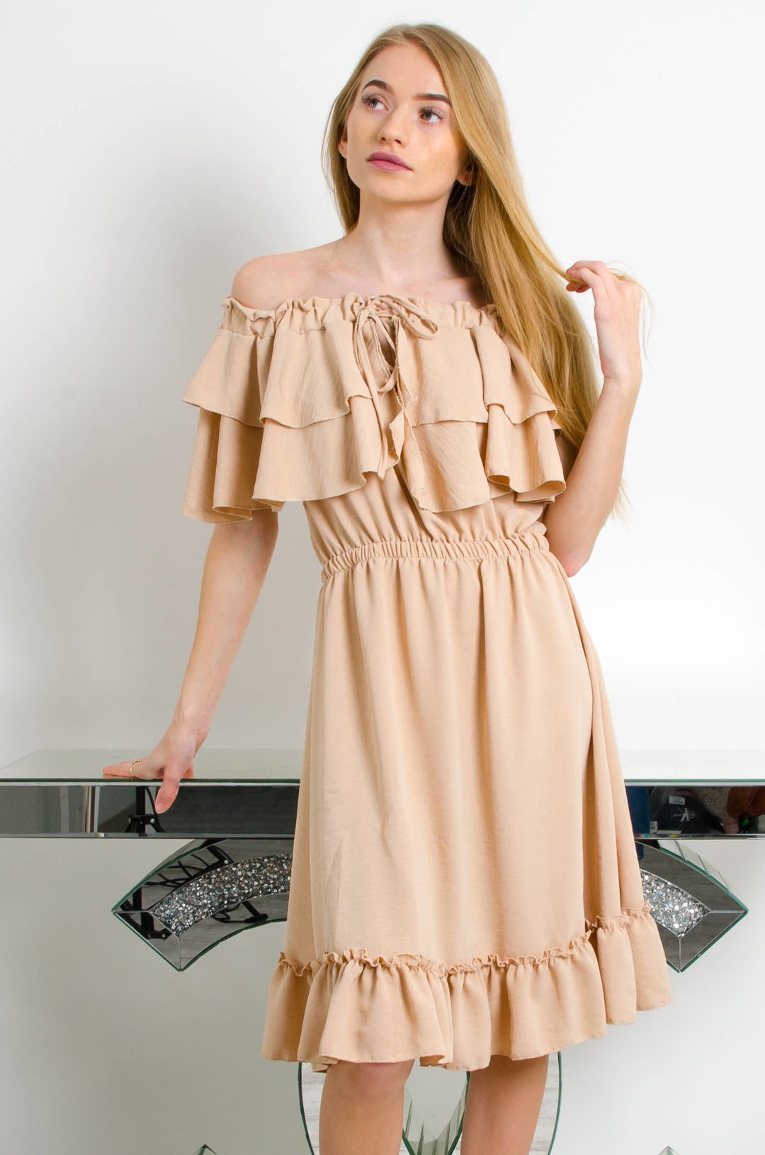 BEŻOWA SUKIENKA HISZPANKA Z FALBANKĄ