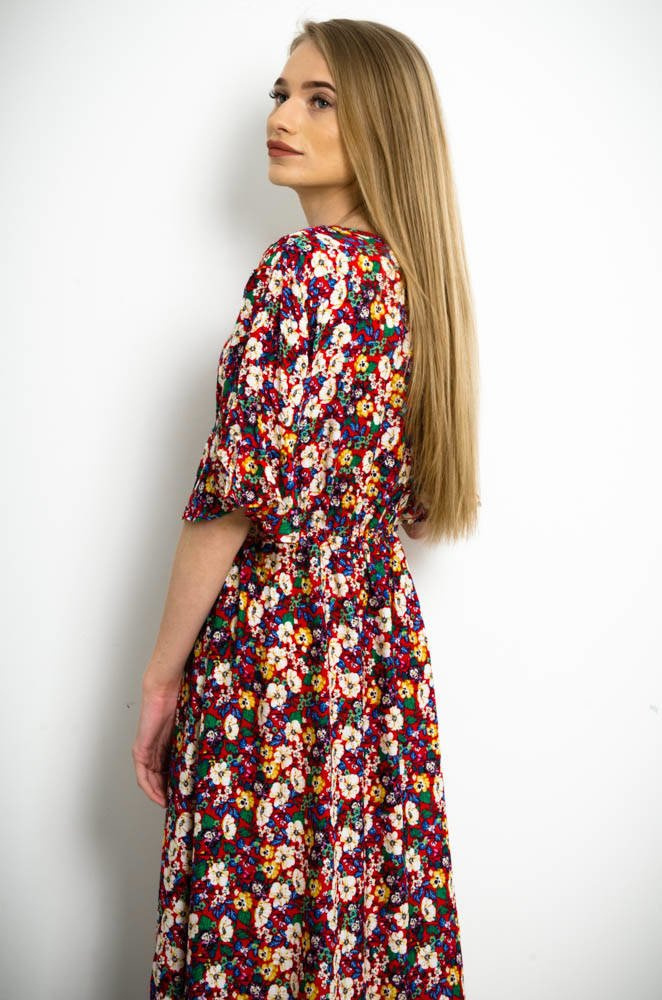 CZERWONA ASYMETRYCZNA SUKIENKA W KWIATY