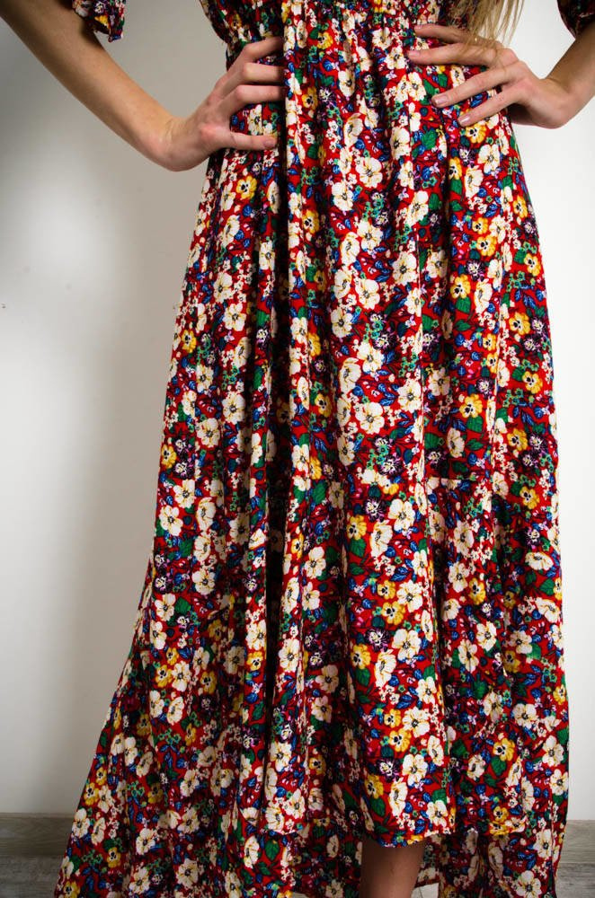 CZERWONA ASYMETRYCZNA SUKIENKA W KWIATY