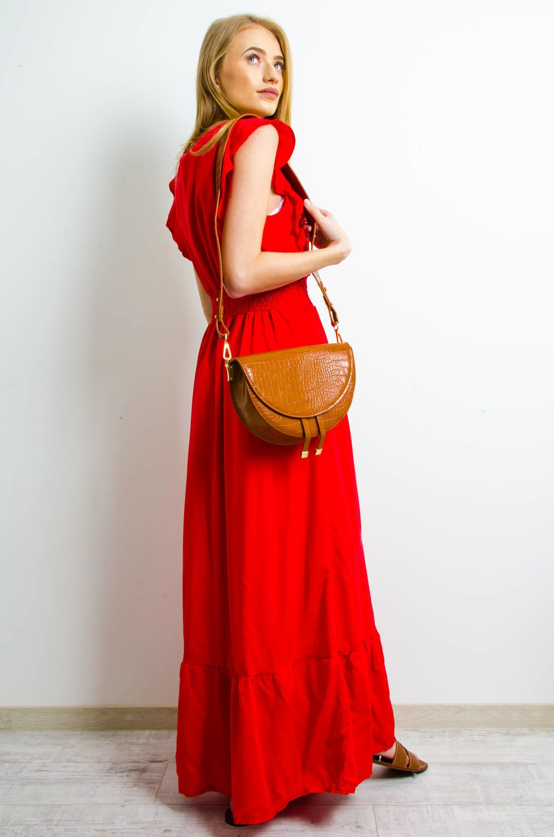 DŁUGA CZERWONA SUKIENKA Z KOPERTOWYM DEKOLTEM