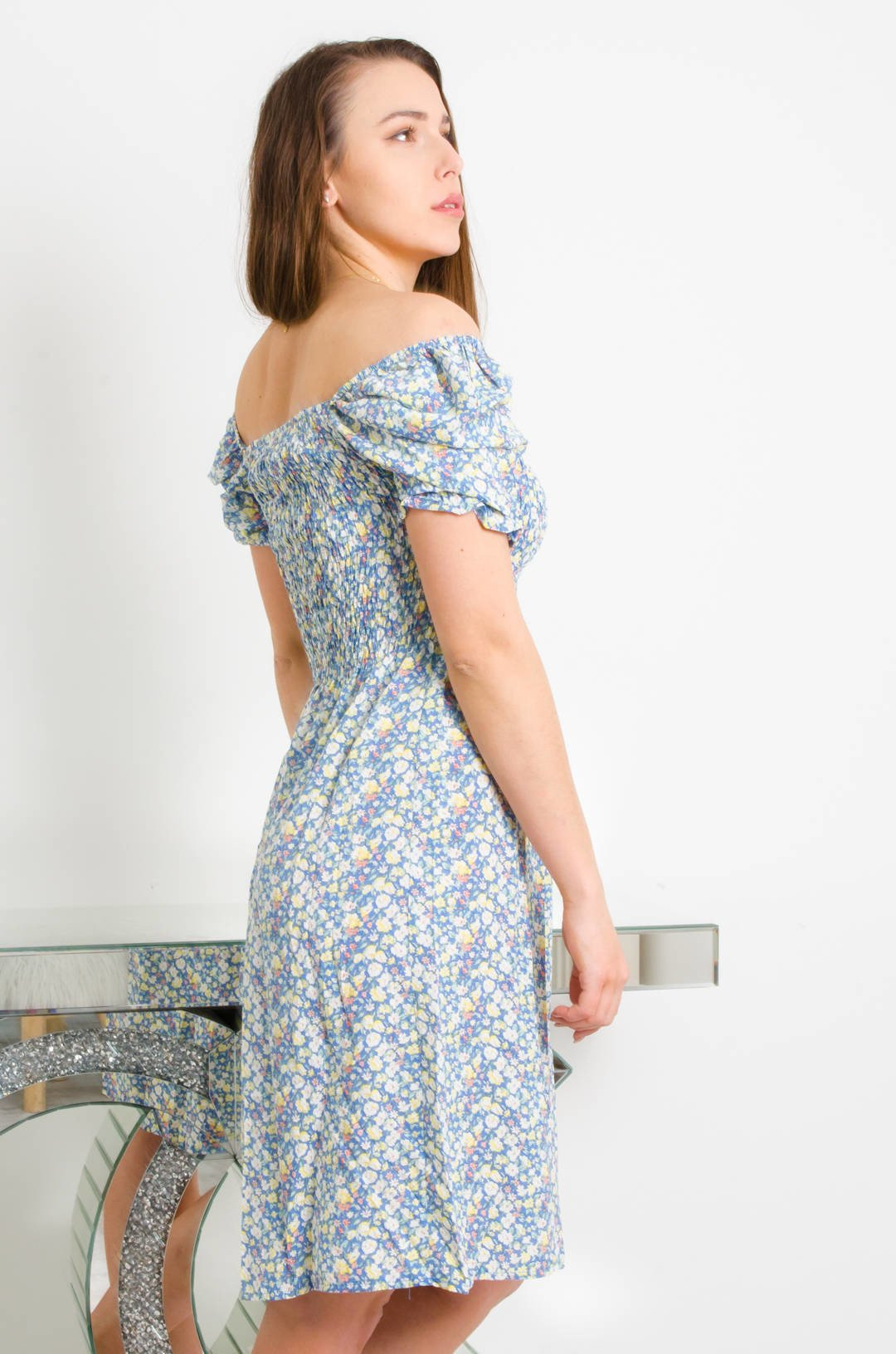 NIEBIESKA SUKIENKA W KWIATY Z BUFKAMI