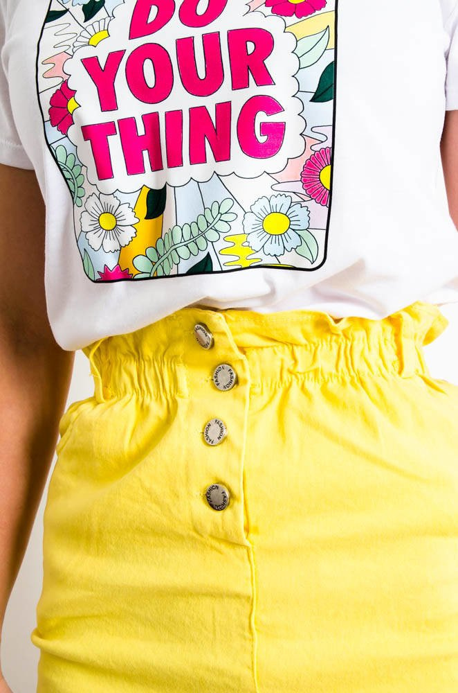ŻÓŁTA MATERIAŁOWA SPÓDNICA ZAPINANA NA GUZIKI-GUMA W PASIE