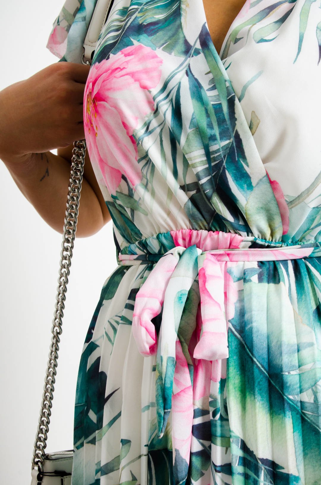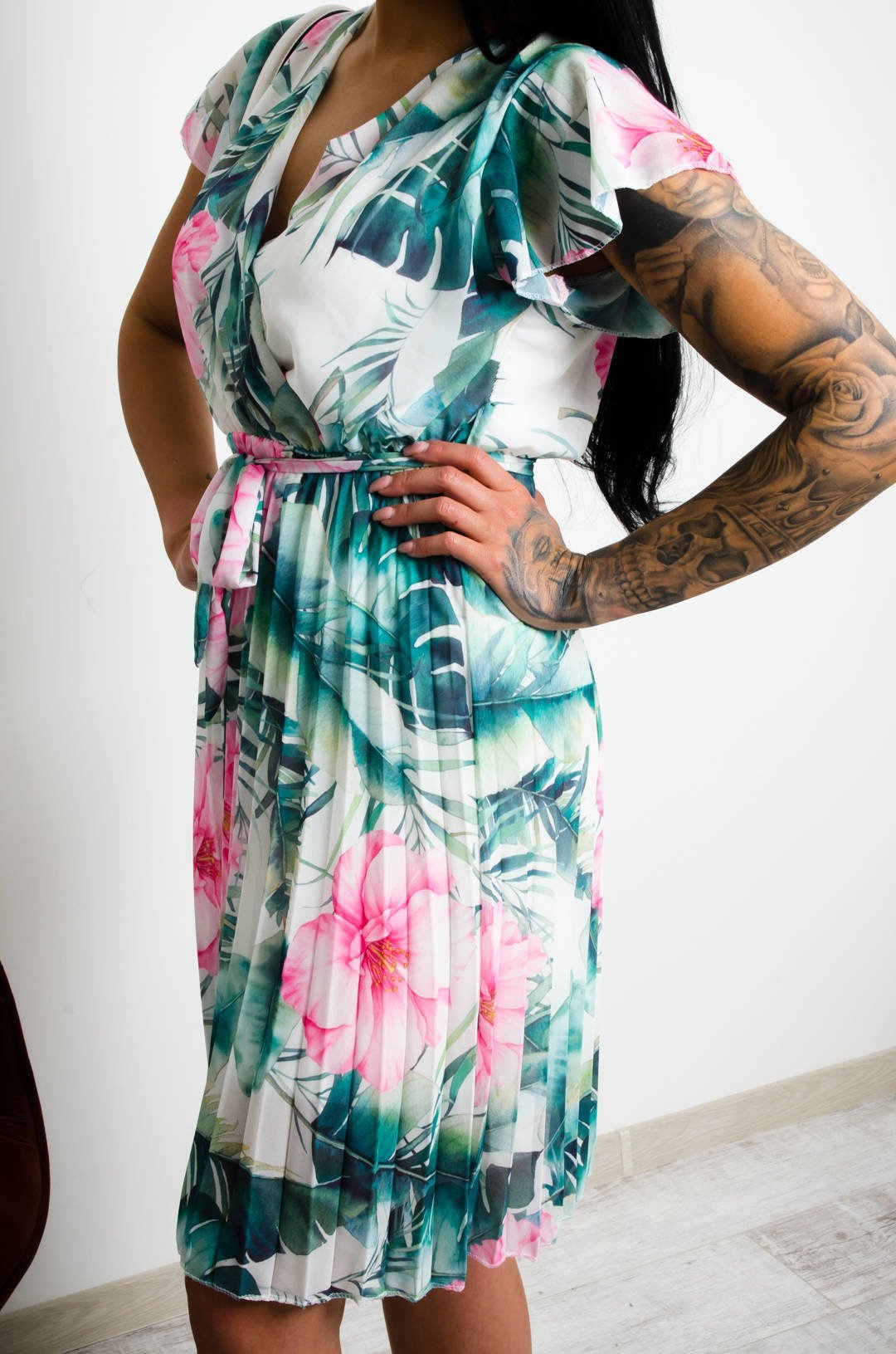 BIAŁA SUKIENKA W ZIELONO-RÓŻOWE KWIATY