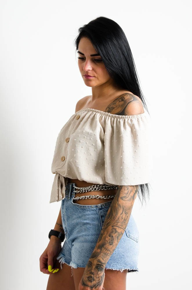 BEŻOWA BLUZKA Z TKANINY PLUMETI Z GUZIKAMI