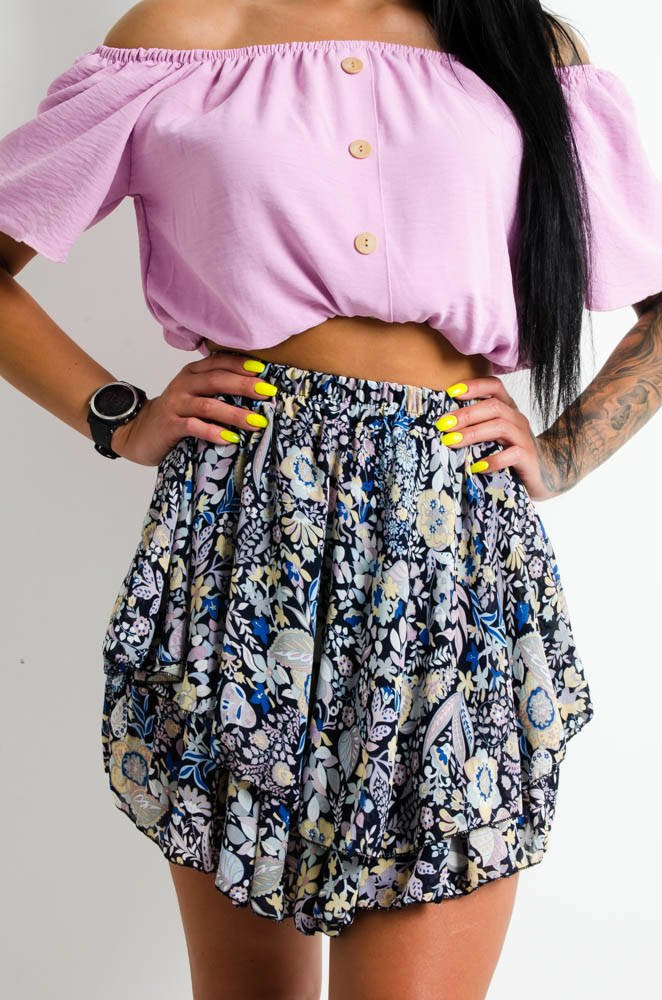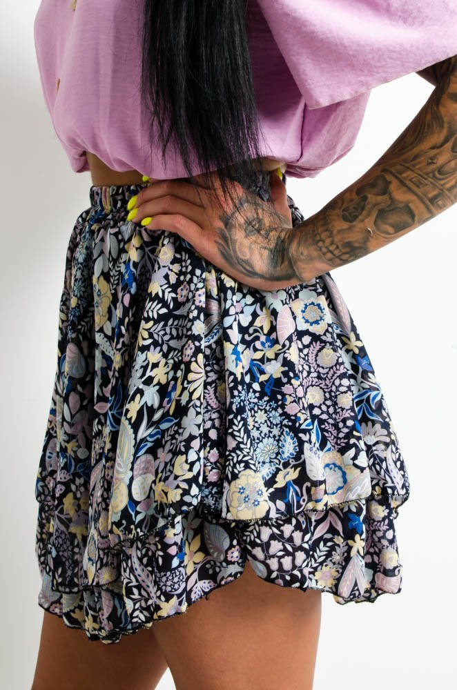GRANATOWA ROZKLOSZOWANA ZWIEWNA SPÓDNICA W KWIATY - KRÓTSZE BOKI