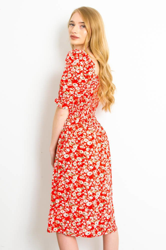CZERWONA SUKIENKA Z BUFKAMI W DROBNE KWIATY