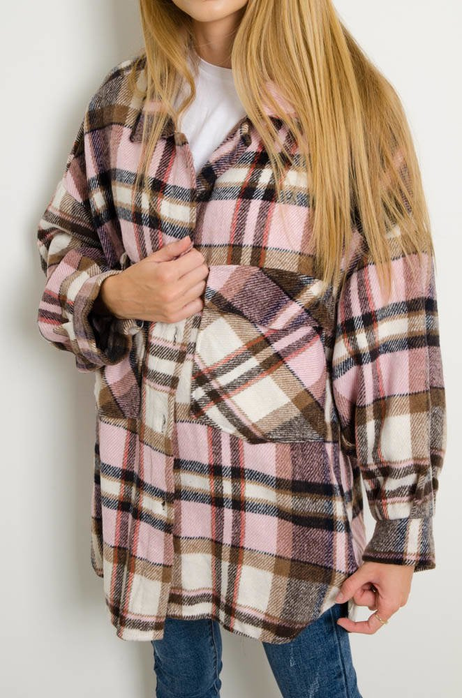 KURTKA KOSZULOWA W KRATĘ - RÓŻOWA