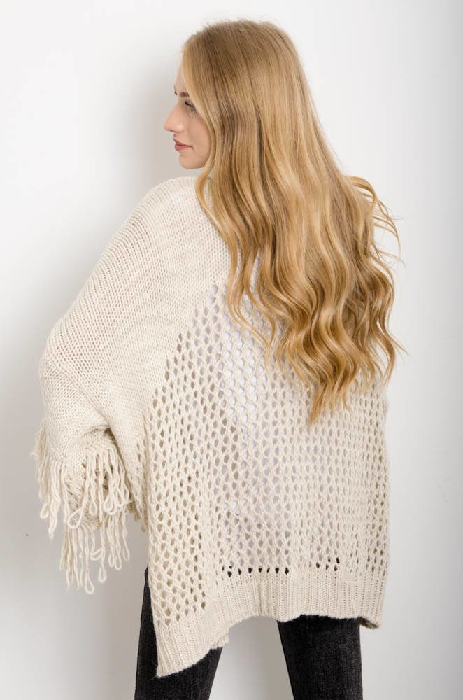 AŻUROWA NARZUTKA Z FRĘDZLAMI W KOLORZE BEŻOWYM