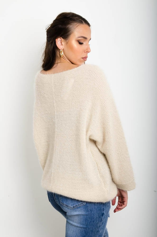 BEŻOWY SWETER NIETOPERZ Z DEKOLTEM W SZPIC.