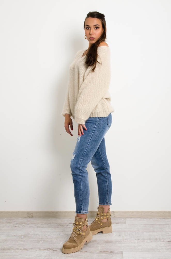 BEŻOWY SWETER NIETOPERZ Z DEKOLTEM W SZPIC