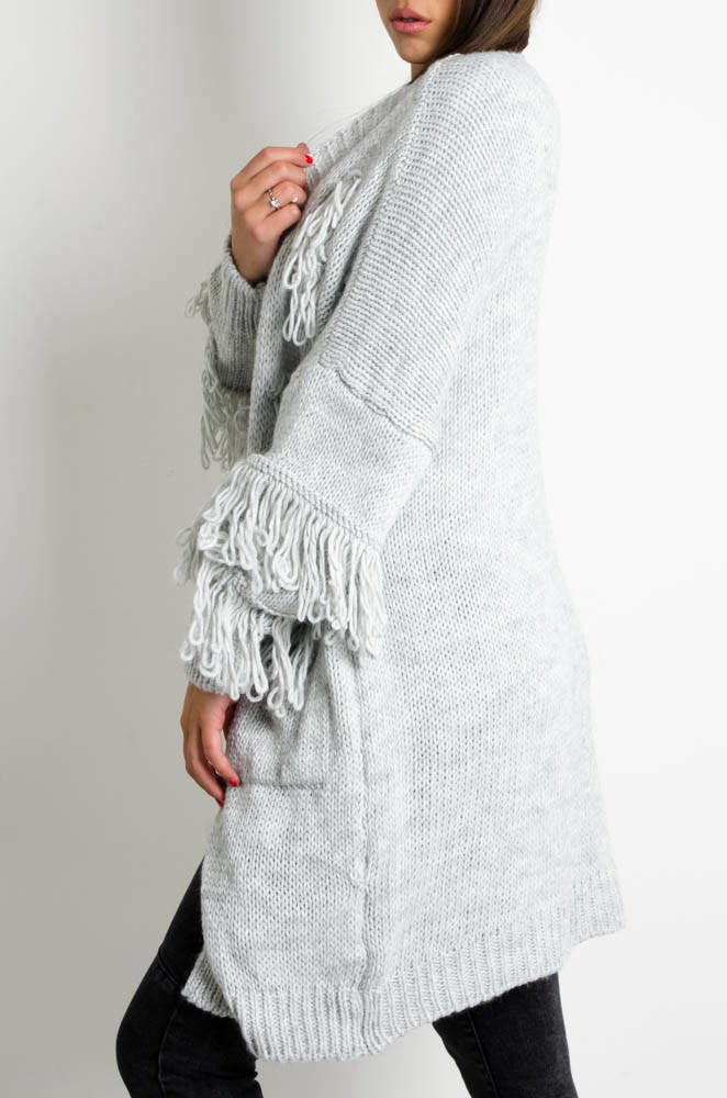 SZARY SWETER KARDIGAN Z FRĘDZLAMI