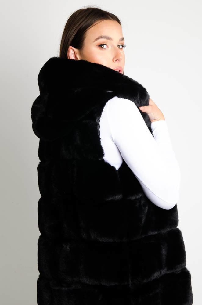 DŁUGA CZARNA FUTRZANA KAMIZELKA Z KAPTUREM