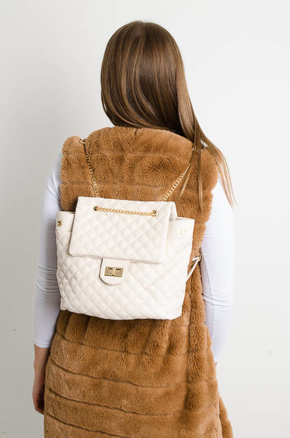 KREMOWA PIKOWANA TOREBKA-PLECAK ZE ZŁOTYM ŁAŃCUSZKIEM