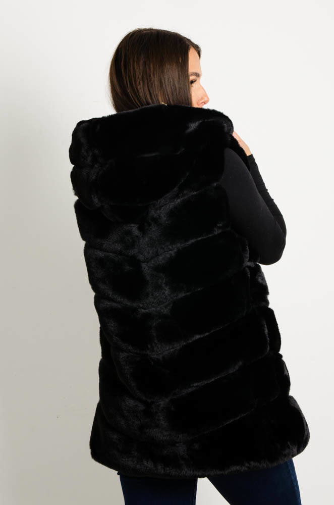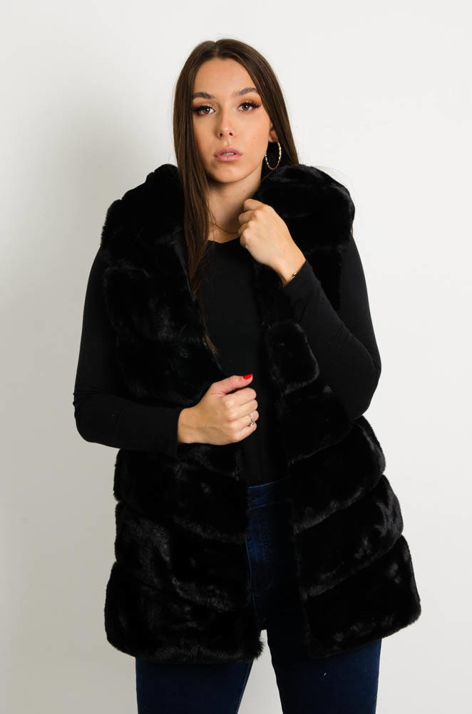 CZARNA FUTRZANA KAMIZELKA Z KAPTUREM