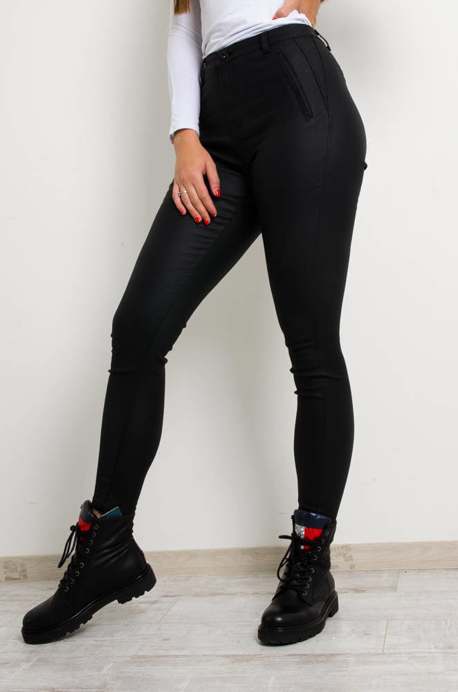 CZARNE MATOWE WOSKOWANE SPODNIE -IMITACJA KIESZENI.