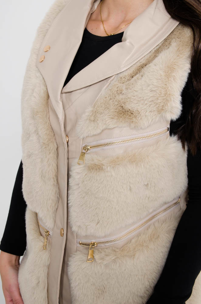 BEŻOWA FUTRZANA KAMIZELKA ZE WSTAWKAMI Z EKOSKÓRY