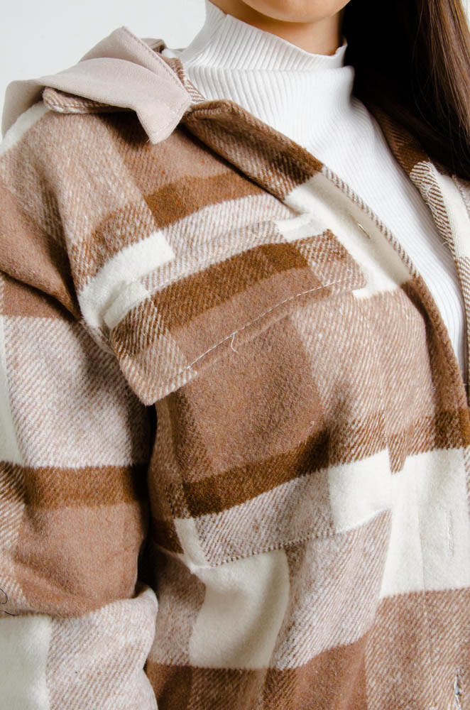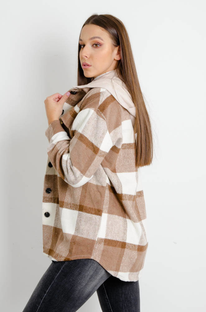 BRĄZOWA KURTKA KOSZULA W KRATĘ Z KAPTUREM