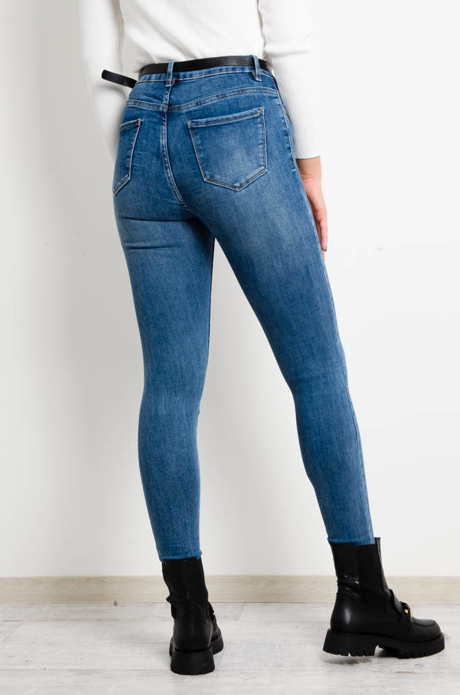 Jeansy z funkcją stretchu, który trzyma i modeluje talię, uda i pośladki oraz zachowuje kształt jeansów. Wysoki stan, rozporek na suwak i guzik. Obcisłe nogawki. Pasek z nerką w zestawie.