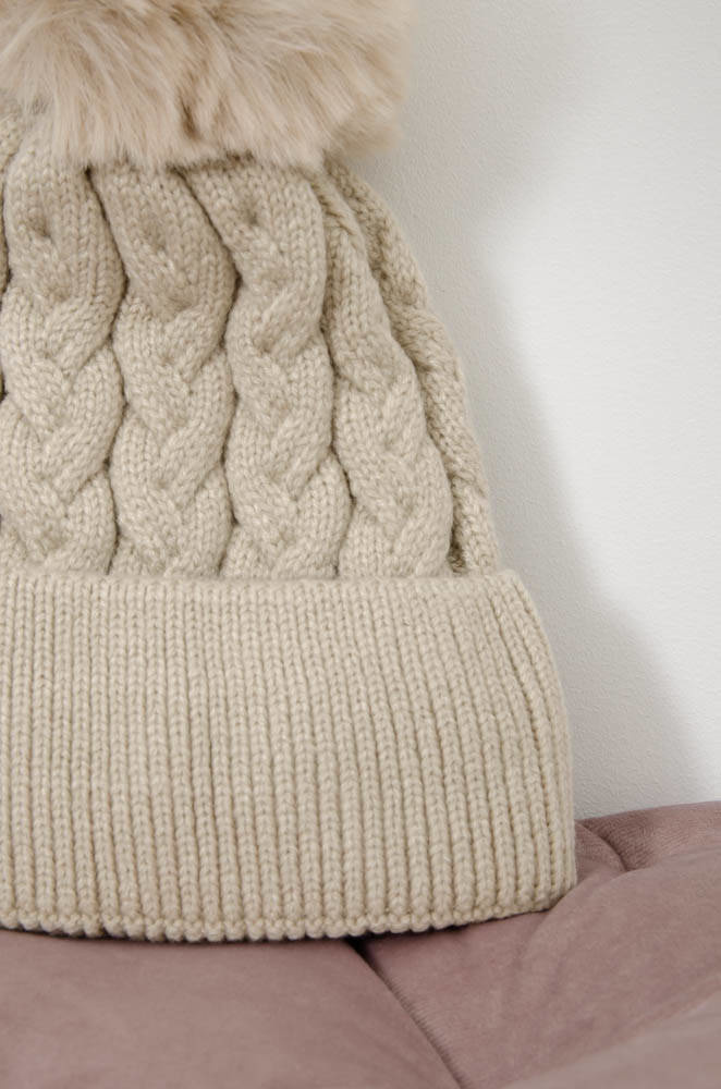BEŻOWA ZIMOWA CZAPKA PLECIONA Z POMPONEM