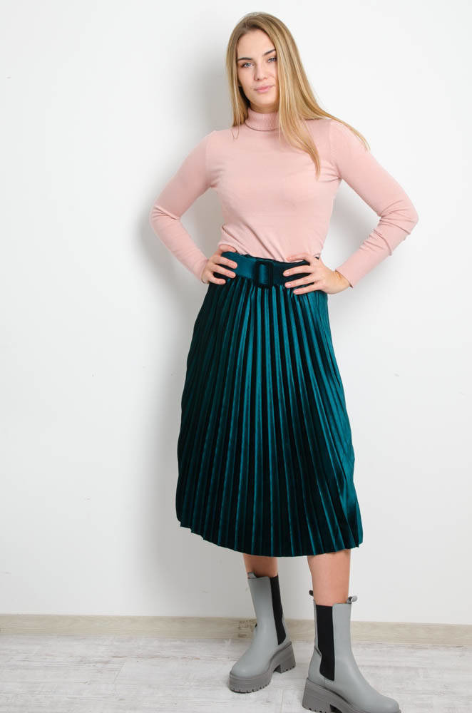 ZIELONA WELUROWA PLISOWANA SPÓDNICA Z PASKIEM-MIDI