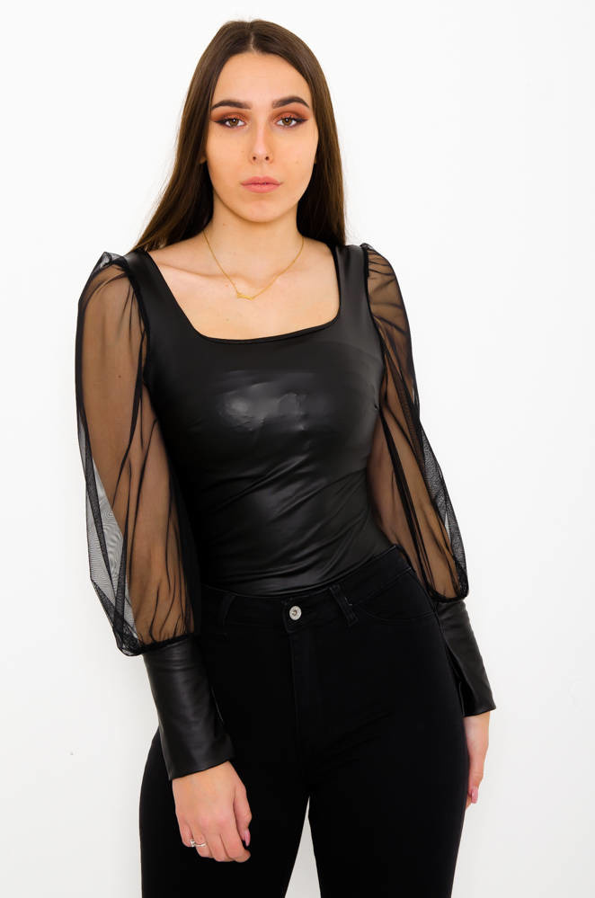 CZARNE BODY Z IMITACJI SKÓRY Z TIULOWYMI RĘKAWAMI