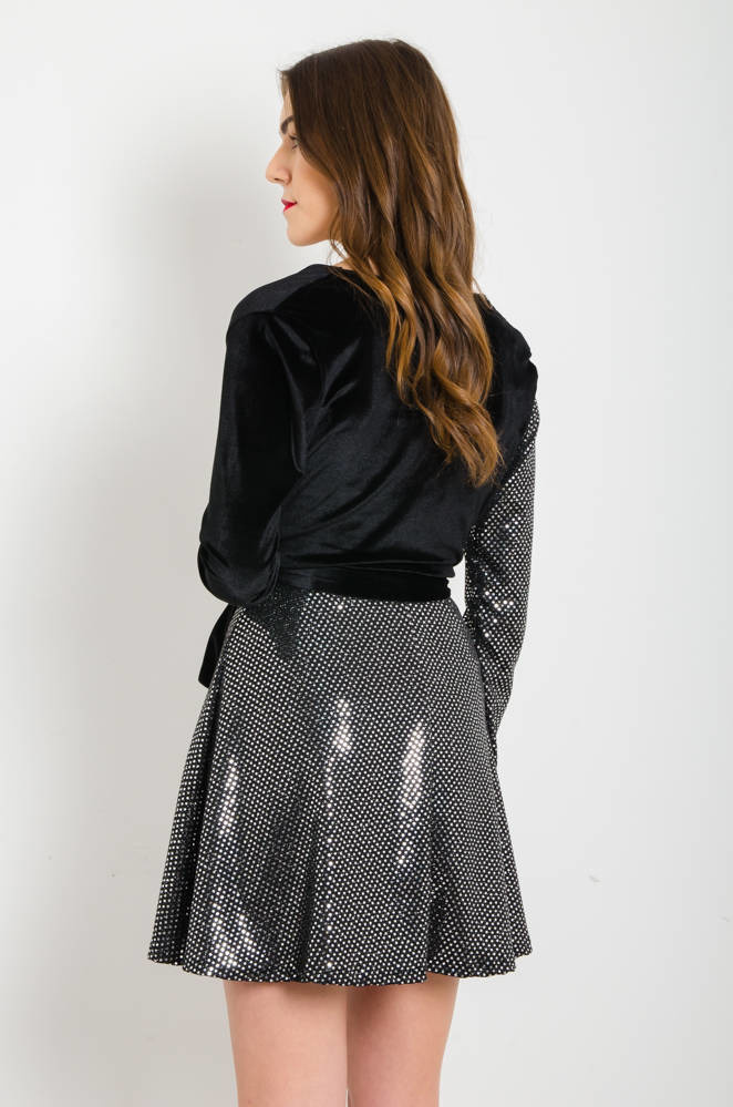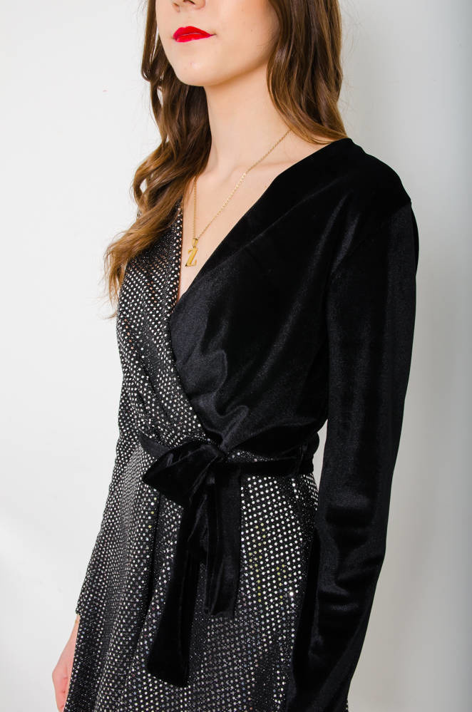 CZARNA WELUROWA SUKIENKA Z CEKINAMI WIĄZANA W PASIE- DEKOLT W SZPIC