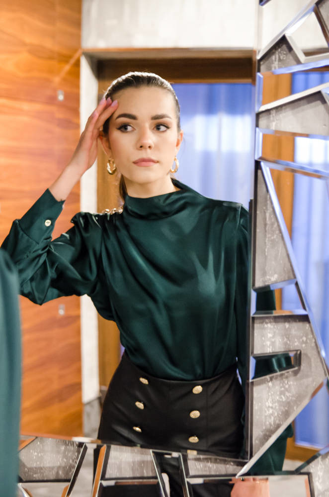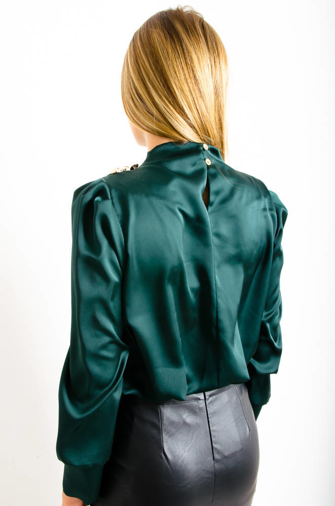 ZIELONA SATYNOWA BLUZKA Z OZDOBNYMI GUZIKAMI NA RAMIONACH