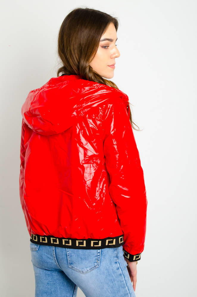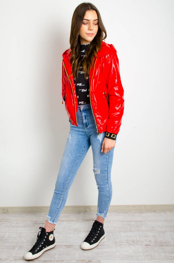 CZERWONA POŁYSKUJĄCA KURTKA WIOSENNA Z KAPTUREM