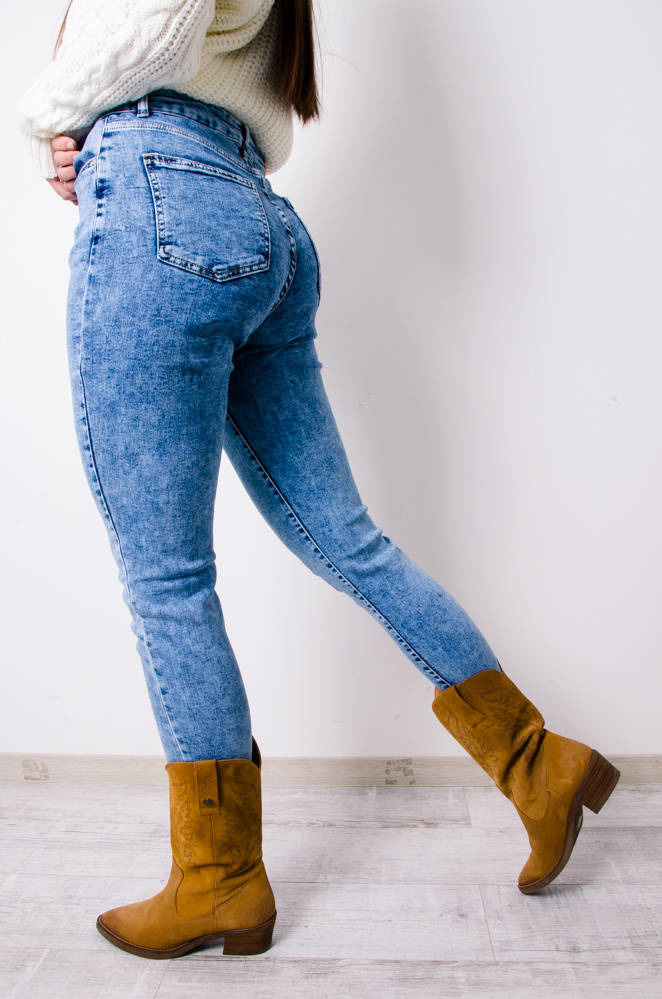 NIEBIESKIE DEKATYZOWANE SPODNIE JEANSOWE Z WYSOKIM STANEM