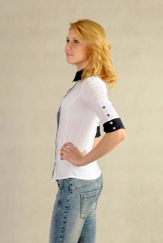 Klasyczna taliowana, elegancka koszula damska zapinana na guziki, z krótkim rękawem.
