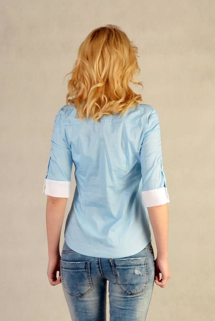 Klasyczna taliowana, elegancka koszula damska zapinana na guziki, z krótkim rękawem.