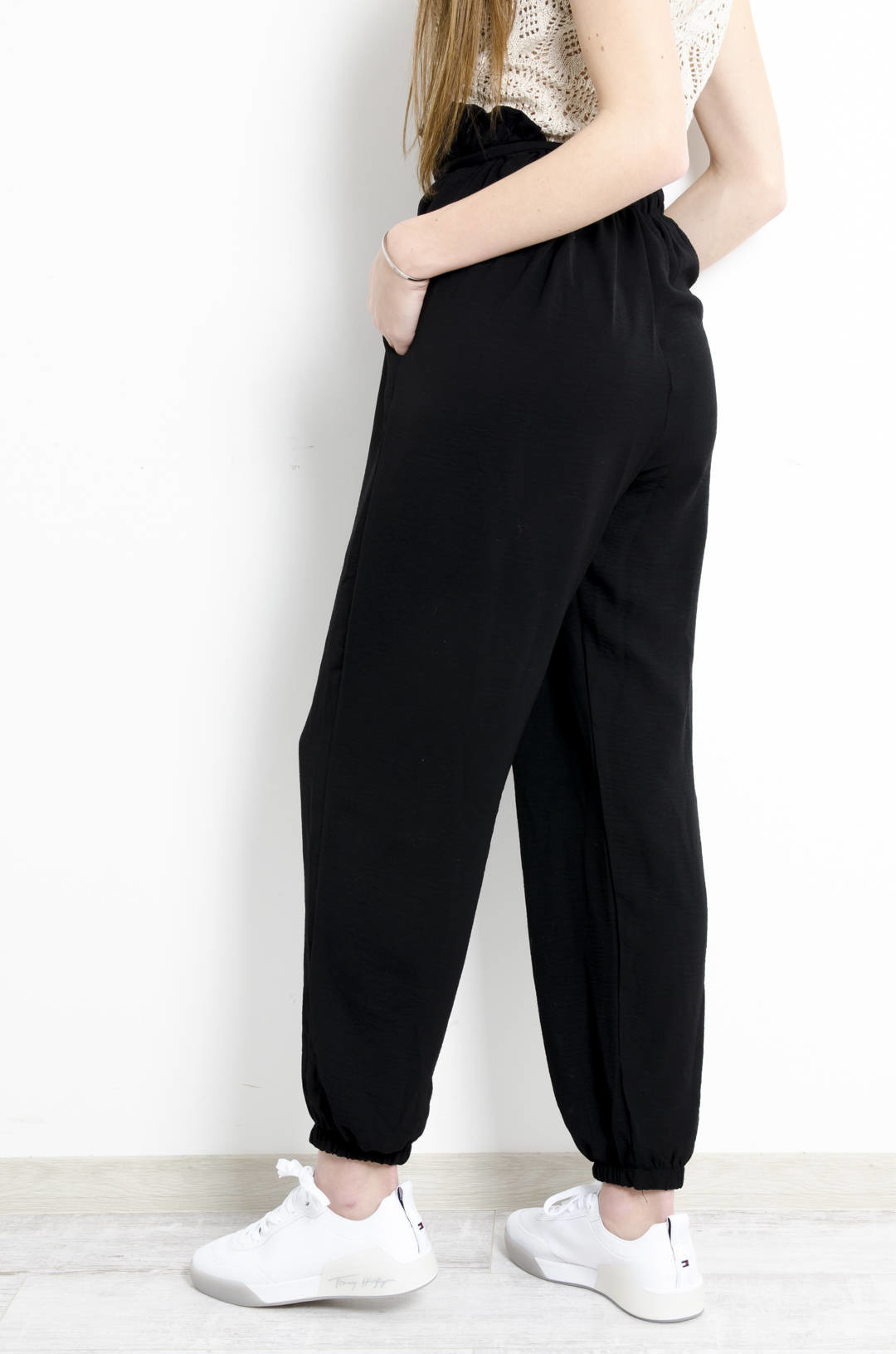SPODNIE MATRIAŁOWE WIĄZANE W PASIE CZARNE