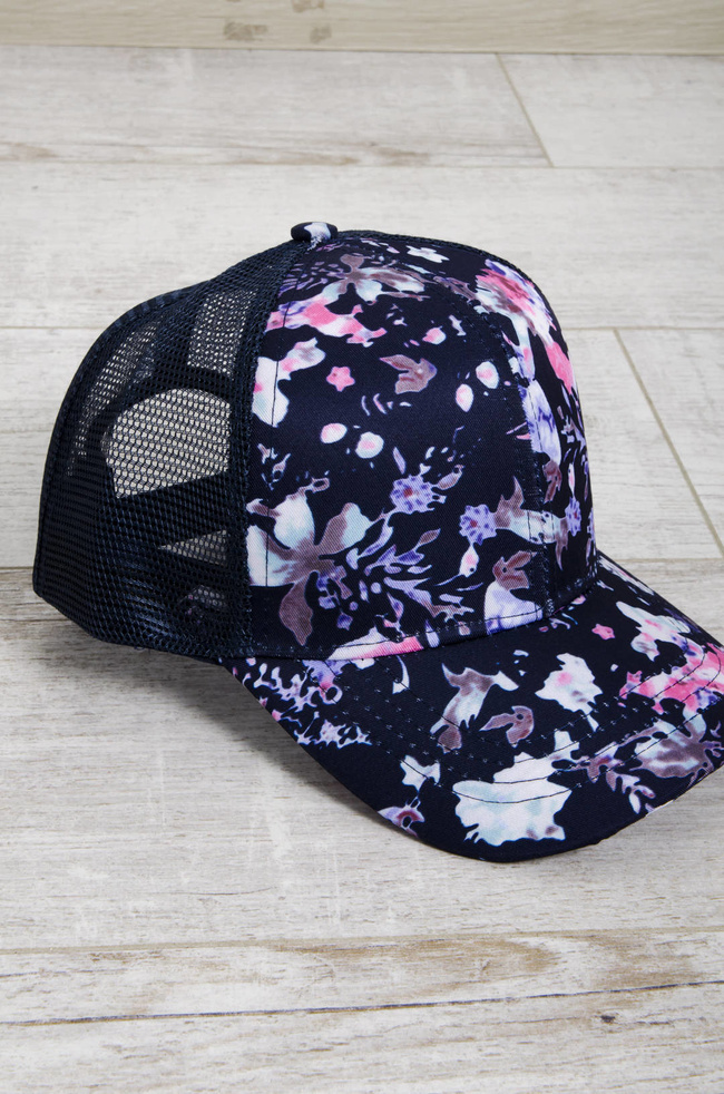CZAPKA Z DASZKIEM W KWIATY- GRANATOWA
