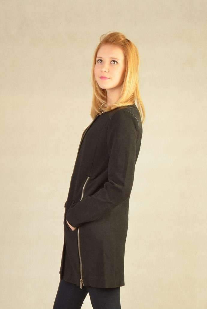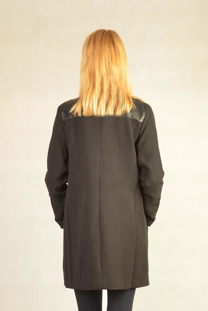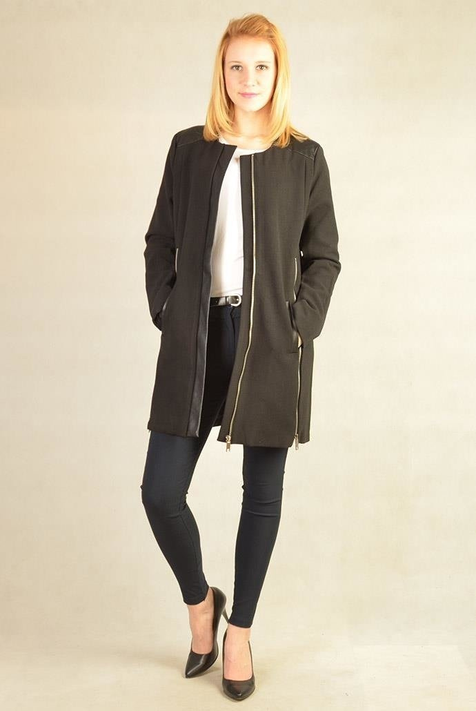 Elegancki płaszcz z kieszeniami zapinanymi na zamek, które są obszyte skórą ekologiczną. Płaszcz będzie idealny na chłodniejsze wieczory.