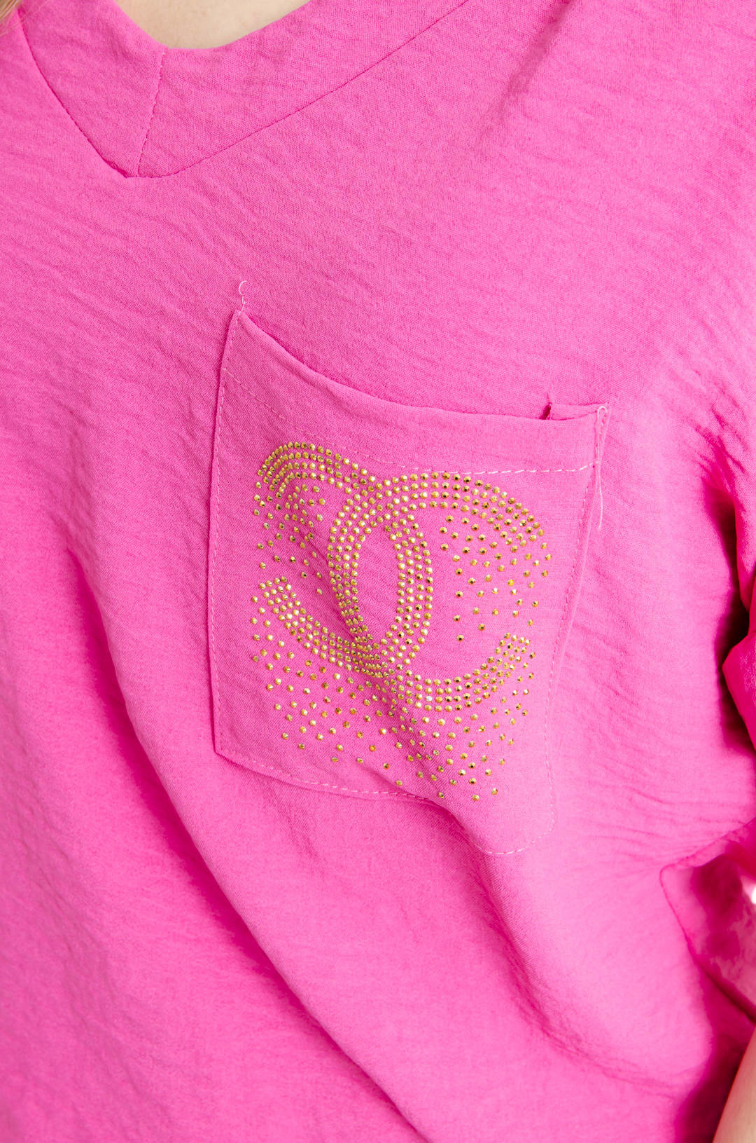 T-SHIRT Z OZDOBNYM ŁAŃCUSZKIEM I FALBANKAMI PRZY RĘKAWACH- RÓŻOWY