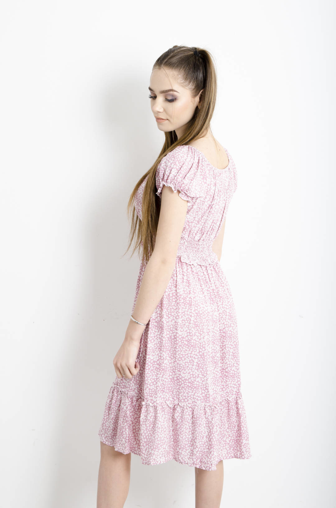 SUKIENKA W KWIATKI Z FALBANKAMI I WIĄZANIEM-RÓŻOWA