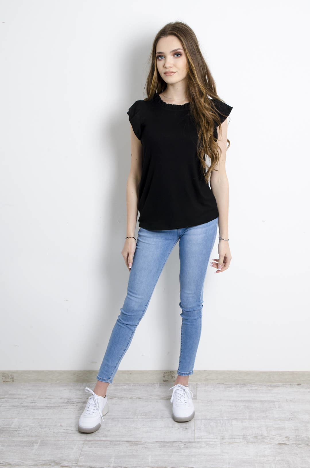 BLUZKA PRĄŻKOWANA Z FALBANKĄ  CZARNA