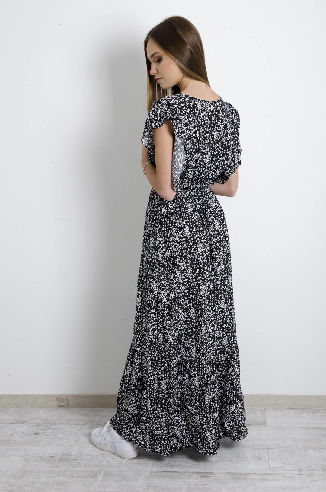 SUKIENKA MAXI W KWIATKI Z FALBANAMI PRZY RĘKAWACH- CZARNA