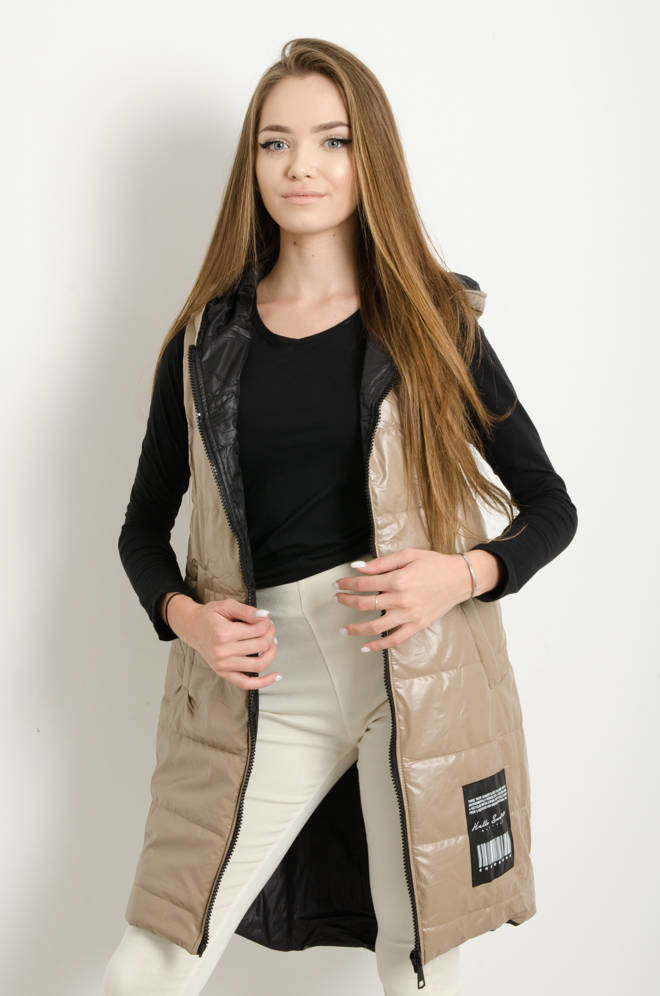 DŁUGA KAMIZELKA Z OZDOBNĄ NASZYWKĄ- BEŻOWA