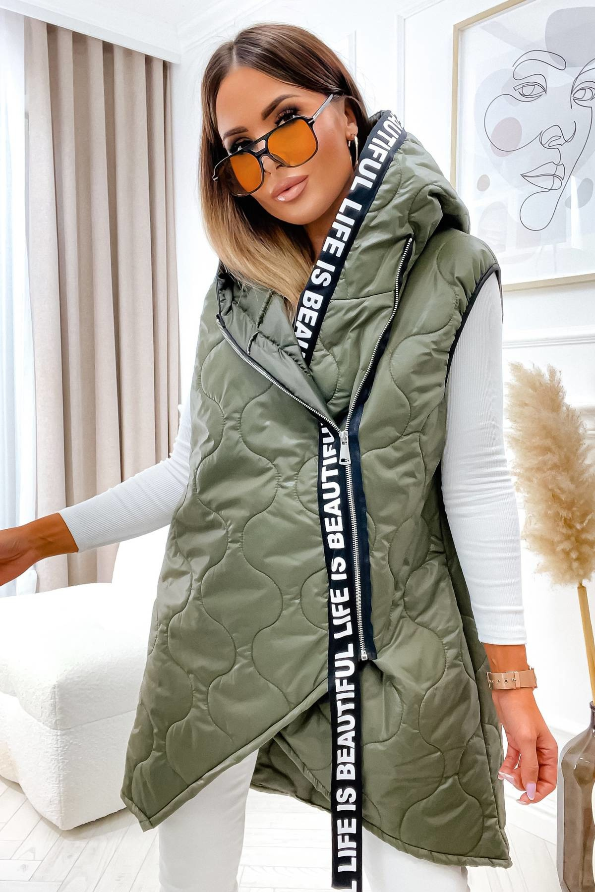 ZIELONA PIKOWANA KAMIZELKA Z OZDOBNYM PASEM