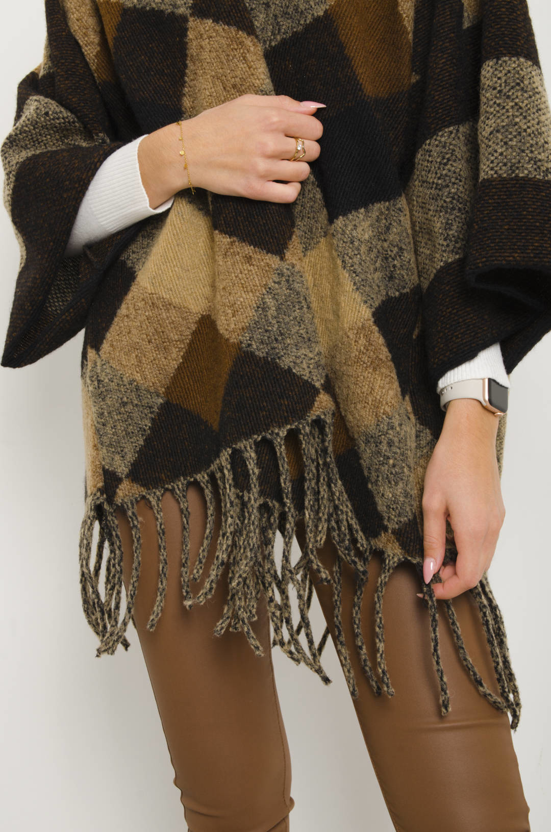 BRĄZOWA NARZUTA W KRATĘ Z FRĘDZLAMI- PONCZO