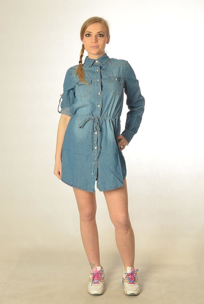 Koszula jeansowa ze sznurkiem zwężającym w talii. Przez swoje przedłużenie aż do ud świetnie nadaje się nie tylko na miasto, ale też na plażę.