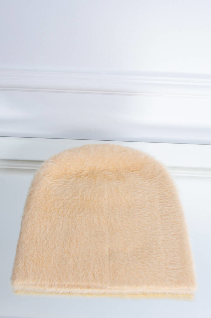 BEŻOWA FUTRZANA CZAPKA Z OZDOBNYMI KRYSZTAŁKAMI