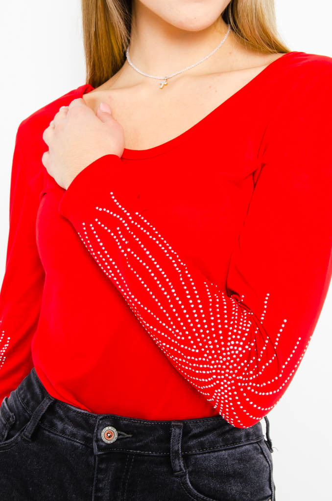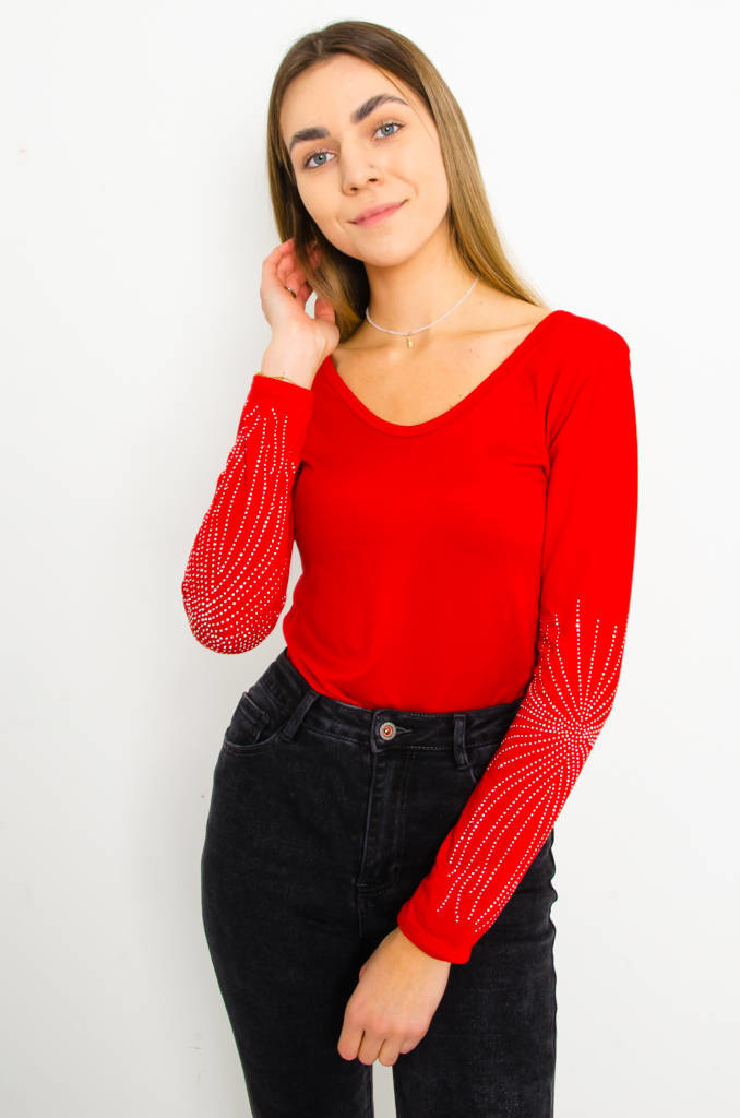 BLUZKA Z OZDOBNYMI CYRKONIAMI NA RĘKAWACH- CZERWONA
