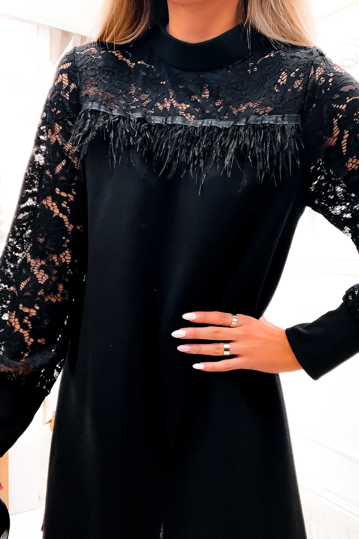CZARNA SUKIENKA Z KORONKOWYMI WSTAWKAMI I OZDOBNYMI PIÓRKAMI