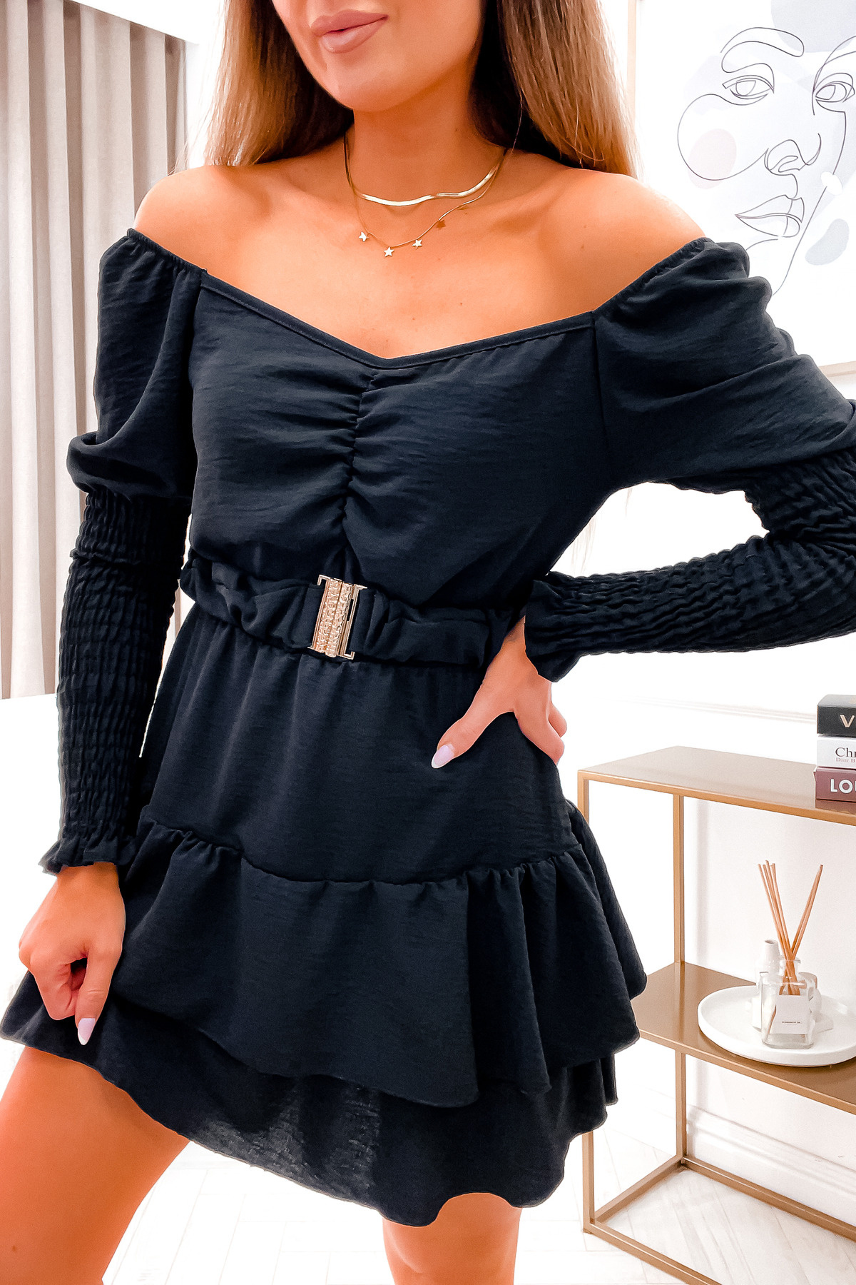 KOMBINEZON Z MARSZCZONYMI RĘKAWAMI I SPÓDNICĄ- CZARNY